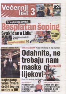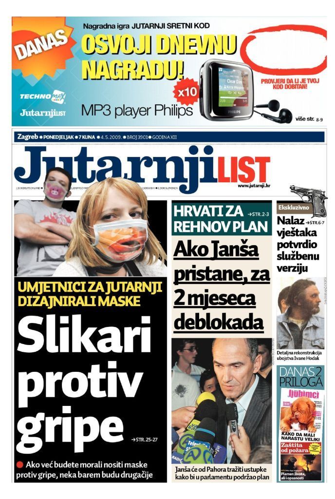 Da li novinari i urednici dok inzistiraju na bombastičnim vijestima o ovoj novoj gripi vide samo priliku za poboljšanje gledanosti i tiraže ili vide i priliku da izbjegnu pisati o temama koje nisu po volji vlasnicima, političarima i oglašivačima, a takvih tema je napretek? Najdalje u dizanju temperature je otišao Jutarnji list koji je tvrdio kako će podijeliti 100.000 zaštitnih maski uz novine. Ne samo da njihova tiraža odavno nije ni blizu tom broju, već je i cijeli ovaj potez s epidemiološkog aspekta potpuno besmislen, beskoristan. Korisnije bi bilo da su čitateljima dijelili – sapun ili papirnate maramice (pogledajte video na kraju teksta). Premda je prilikom ludila oko ptičje gripe u listopadu i studenom 2005. godine situacija bila upravo obrnuta ovog puta su se u Večernjaku (valjda zato što nisu prvi objavili da će dijeliti maske) odlučili narugati konkurentima i umirivati javnost ističući na naslovnici kako zaštitne maske uopće nisu od koristi. Sada nam još samo preostaje da netko uz pretplatu ponudi kupcima na poklon kutiju Tamiflua.